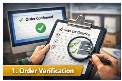 We confirm the order and make sure the correct part number, quantity, and any special requests match what’s on the sales confirmation